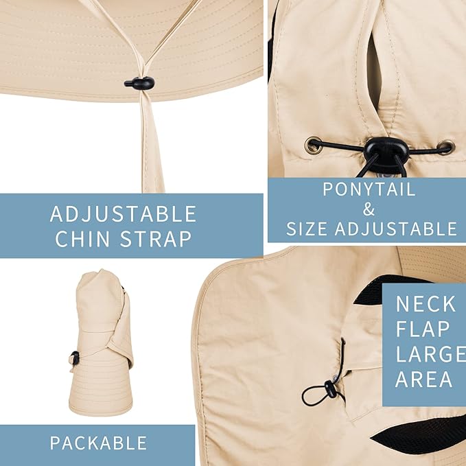• PERFECT SUN PROTECTION FOR HEAD AND NECK – The outdoor hat has a large wide brim and neck flap to protect you from the blazing sun at all angles. The hat is rated for 50+ UPF to protect against harmful UVA and UVB rays, offering complete UV protection for your face, ears, and neck.