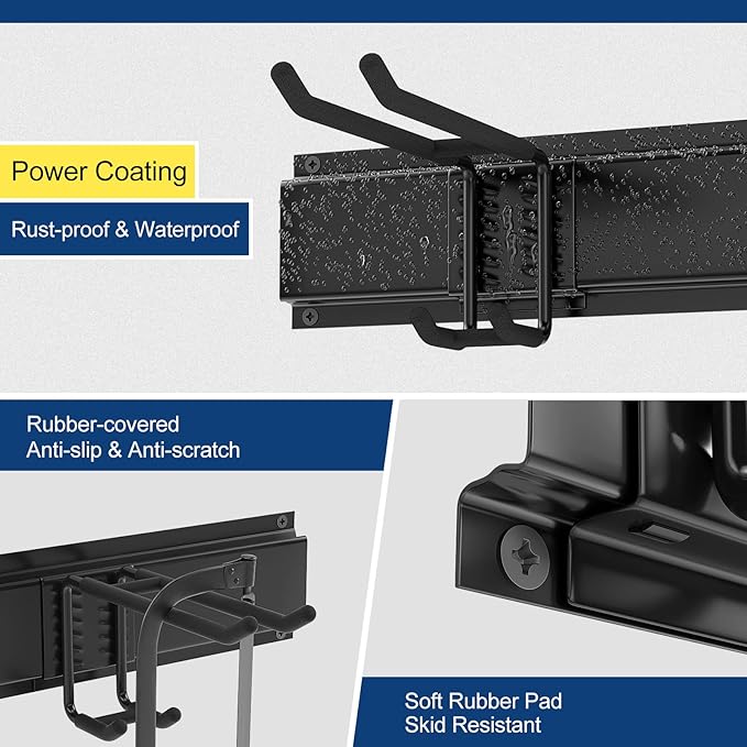 - 【Adjustable Rubber-coated Hooks】- The garage organizers and storage have 3 pcs large J hooks, 3 pcs double layer long hooks and 2 small J hooks and 2 extension straps are designed to fit all your needs. All the hooks wrapped in rubber to protect your tools from sliding and getting damaged.