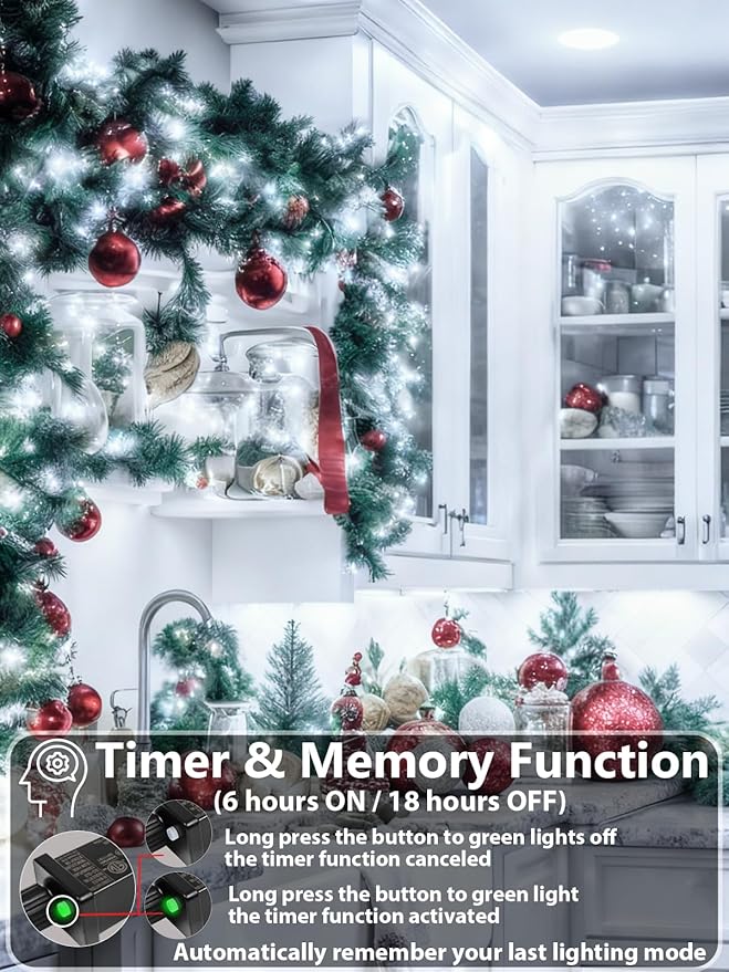 - Timer Function and Memory Funtion: With built-in timer IC, long press the button of the adaptor to green, the timer function acitivated and it will be on for 6 hours and off for 18 hours repeatedly everday. The Xmas lights also have memory function, will remember your last lighting mode, free your hands from pressing the button everyday.