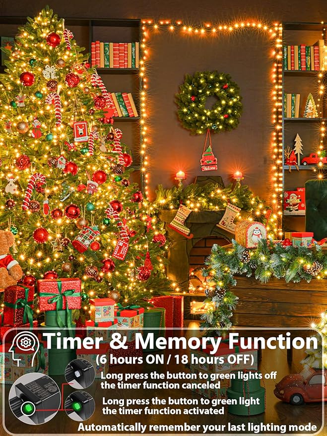 - Timer Function and Memory Function: With built-in timer IC, long press the button of the adaptor to green, the timer function activated and it will be on for 6 hours and off for 18 hours repeatedly everyday. The Xmas lights also have memory function, will remember your last lighting mode, free your hands from pressing the button everyday.