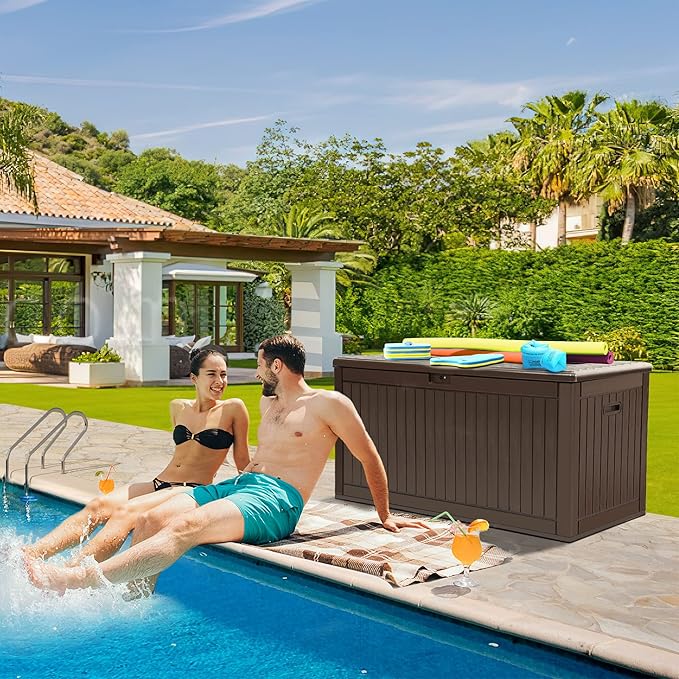 - MULTIPURPOSE GARDEN STORAGE:Doubles as an extra table or bench to accommodate six adults of up to 1000lbs., this deck box blends into any yard or patio while storing patio cushions, gardening tools, pool supplies, etc