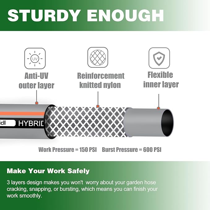 - Easy to Handle and Clean : The 75 ft water hose heavy duty is made of hybrid polymer rubber material, flexible and suitable for most people.