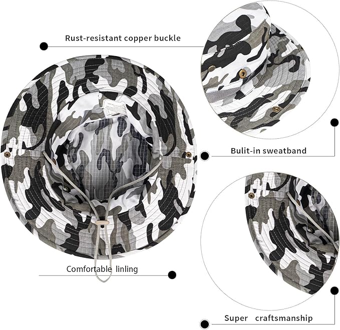 • GOOD DESIGN WIDE BRIM HAT:The well-designed summer outdoor hat has two ways to use it. Both sides are equipped with rust-proof buttons. When the brim is rolled up, it is a cowboy hat. Loosen it, will be a fashionable sun-proof fisherman hat/safari hats for men and women.