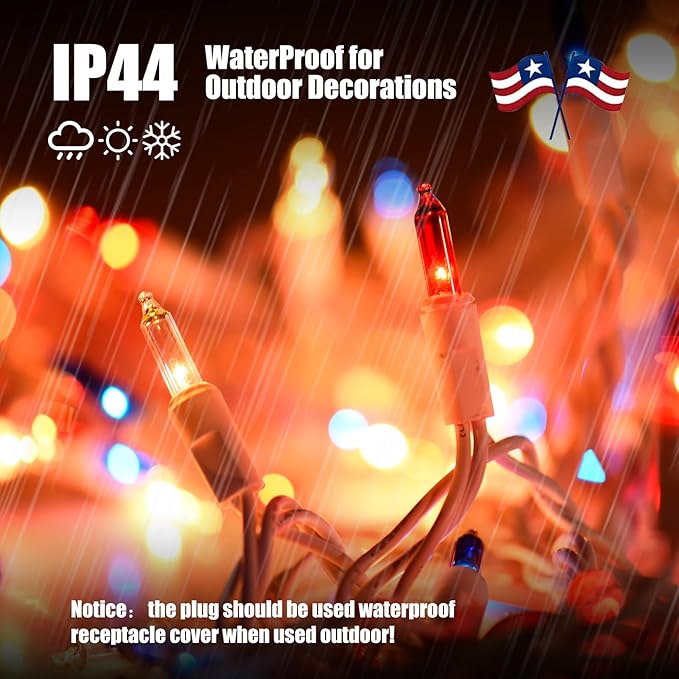 - IP44 Waterproof for Outdoor & Indoor Use: All of our 4th of July lights are constructed with high quality material and designed to withstand rain, so you can confidently leave them on display through summers and winters. Perfect for indoor & outdoor decoration. Lights can be utilized both indoor and outdoor without worry of rainy weather, the high quality wire can keep the lights for long time use.(Please be attention: please keep the plug away from water.)