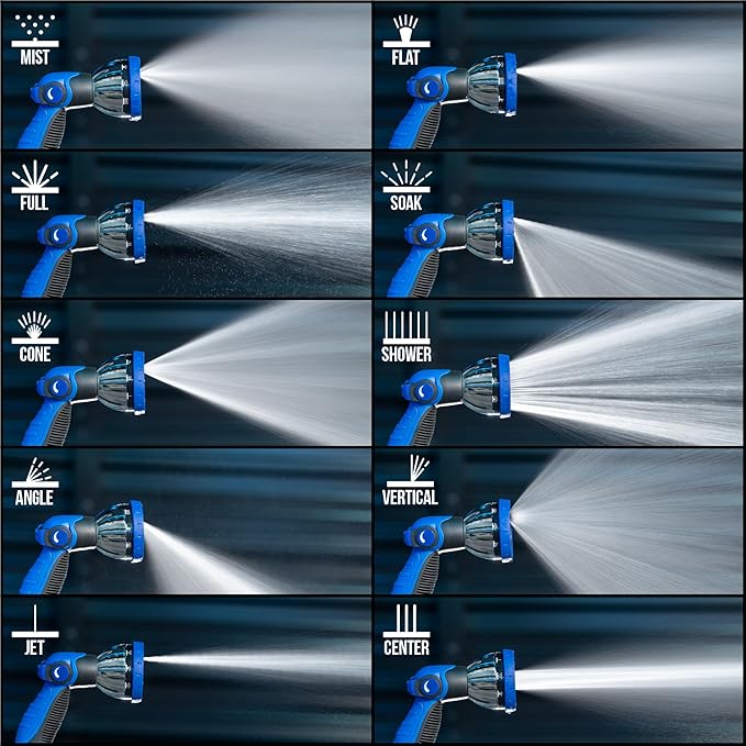 - Water hose sprayer nozzle fits on a standard garden hose has 10 different spray patterns and adjustable flow levels to fit your every need, from cleaning patio furniture to washing the dog