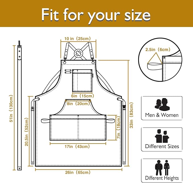 - Fashionable and Professional Protection: This canvas apron is designed to be stylish and provide professional protection, providing good coverage and protection from the chest to the knees, preventing grease , sawdust and dirt from dirtying clothes