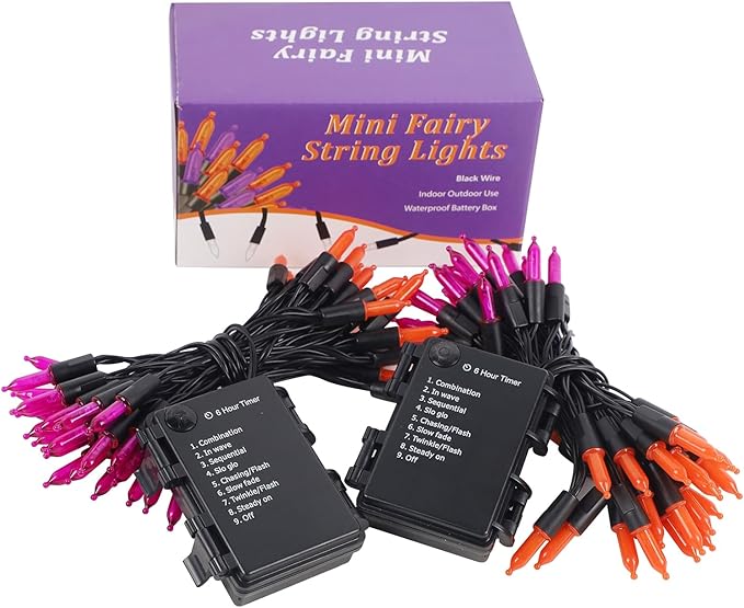 - [8 Lighting Modes]: WATERGLIDE 2 pack 50LED Halloween orange and purple mini string light has 8 lighting modes for you to choose - Combination, In waves, Sequential, Slow Glow, Chasing/Flash, Slow fade, Twinkle/Flash, Steady on. Adjust the lighting modes by pressing the round button on the battery box