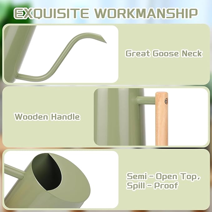 - DECORATIVE AND FUNCTIONAL- No need to hide this decorative watering can after use. The modern, minimalist design fits into any decor and looks great on display. Featuring a sleek matte olive green spray can body and solid wood handle, this spray can also doubles as a decoration!