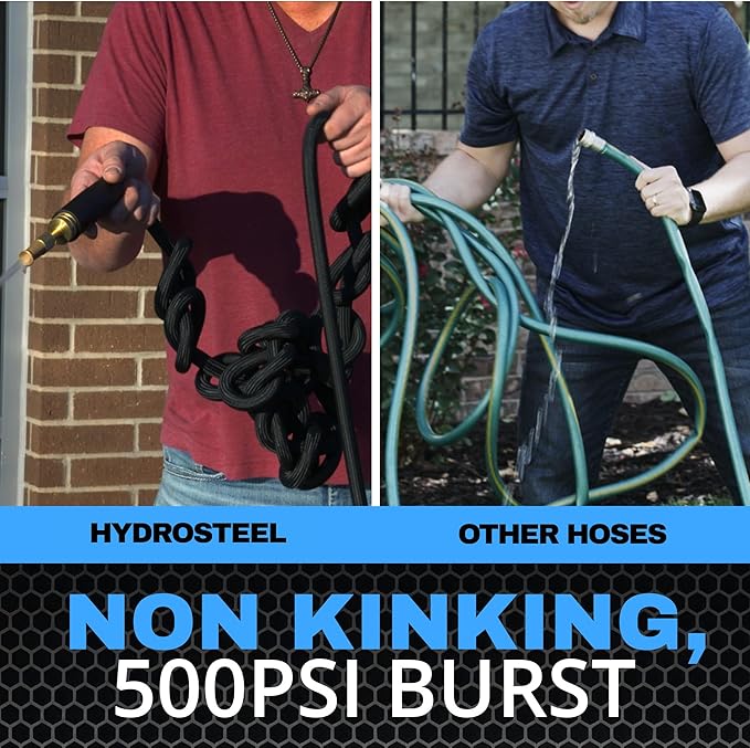 - KINK RESISTANT: Hydrosteel is encased in a sturdy stainless-steel outer layer allowing for a consistent, steady and high-pressure water output yet is memoryless, meaning it will lay flat, resist kinks, can coil easily and store effortlessly.