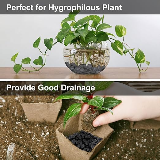 - ROUND AND SMOOTH: Our polished black pebbles for plants are tumbled to produce the smooth and round rock for all creative interior and exterior designs. No sharp edges, ready to get on your feet. River rocks are gift from nature, so they are in different shapes such as oval, round etc. Due to their shape, these pebbles are perfect for bottom of planters for drainage to help soil retain moisture. At the same time, the river rocks make planters have a pop of elegance.