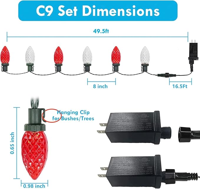 - [Total 98ft 100LED & C9 Christmas Lights]: C9 Christmas lights 2PK Total long 98ft with 100 LED red and cool white lights individual bulbs, each 33ft string lights with 16ft leading wire, it's long enough for wrapping around Christmas tree, or wherever you like to light up, Porch, Gardens, Lawn, Yard, Gate etc.