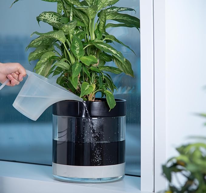 Phoenix Vine 10 Inch Self Watering Terracotta Planter, Black Terracotta Clay Pot with Glass Reservoir for Indoor Plants, Herbs, Flowers, Set of 1, 52-C-I-1