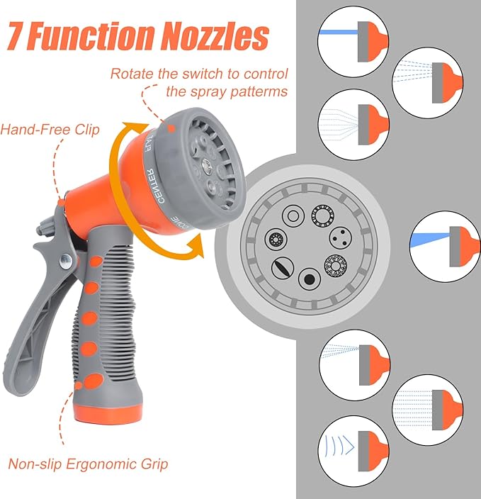 - Multifunctional Nozzle Sprayer : We provide a plastic hose nozzle including 7 patterns,such shower,center,jet,etc,which make it suitable for various needs, such as watering flowers,cleaning,washing car.The hose nozzle sprayer has a ergonomic handle,you can hold it more effortlessly for a long time.