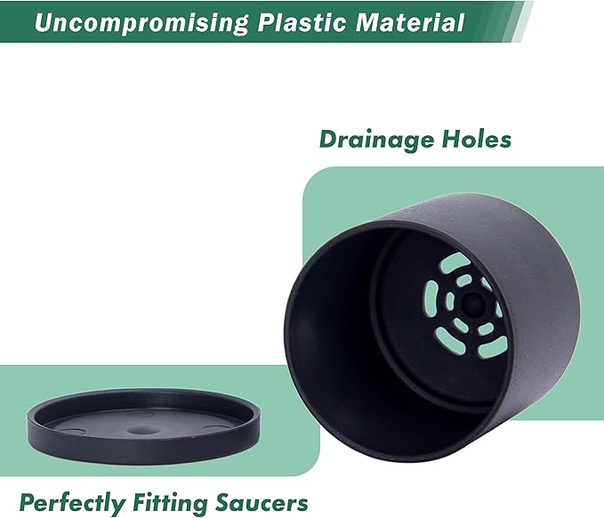 - What's Included: Set of 18 black plastic pots with saucers, 2.5" in Opening Diameter, 2.5" in Height.
