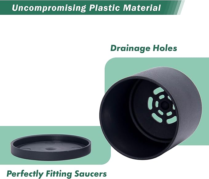 - What's Included: Set of 24 black plastic pots with saucers, 2" in Opening Diameter, 2" in Height.