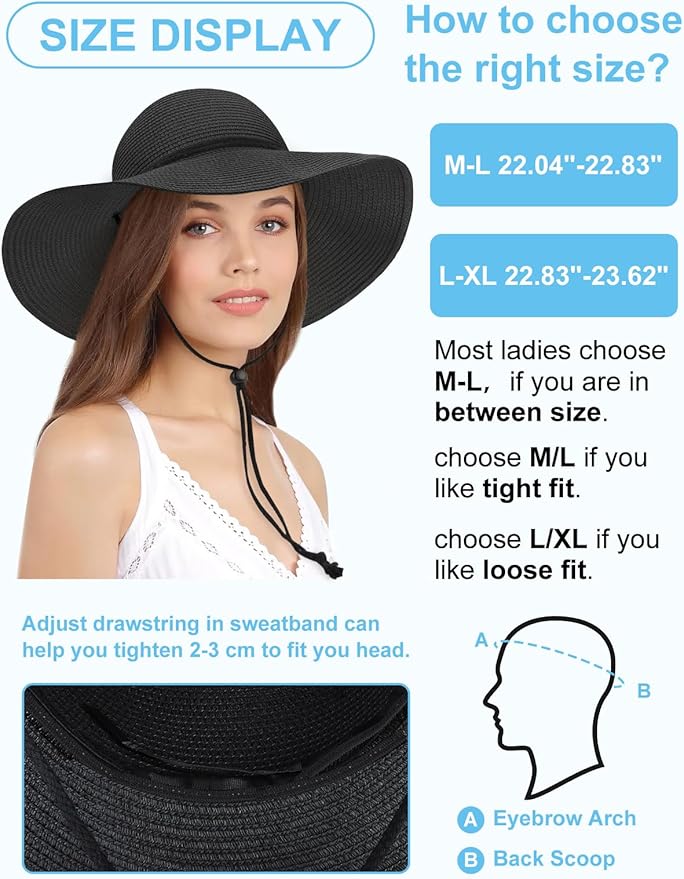 - Two Sizes for Most: Straw hats have two sizes, size M-L is recommended for head circumference around 22.04"-22.83", size L-XL for head circumference 22.83"-23.62"; Adjustable drawstring make sunhat fit your head comfy