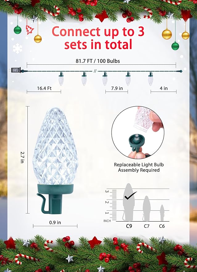 - Special Feature : 8 Lighting Modes, LED C9 Strawberry-Shaped Bulbs, Christmas Tree Decorations, Memory Function, Timer Function: 6H on & 18H Off, UL certified, Waterproof, Connectable 8 Lighting Modes, LED C9 Strawberry-Shaped Bulbs, Christmas Tree Decorations, Memory Function, Timer Function: 6H on & 18H Off, UL certified, Waterproof, Connectable