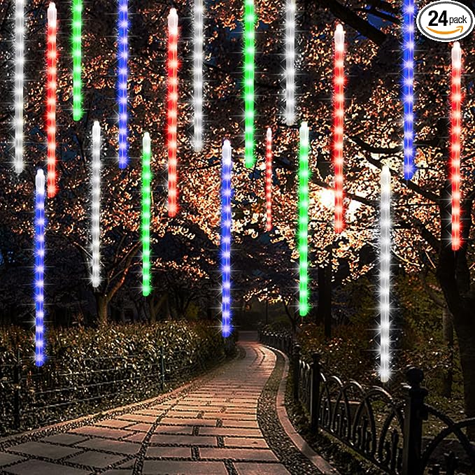 - Meteor Shower Falling Design: 24 icicles with 864 SMD LED multicolor falling lights are sure to bring brightness to your home outdoor Christmas decoration. Each LED on this raindrop lights will on and off one by one, the light drop at the same time and there will be a delay between each tube, just like a meteor shower or a snow falling across the Christmas night sky. Please note that the "Item Package Quantity 3" means you will get 3 x 8 tubes with ONLY ONE adapter