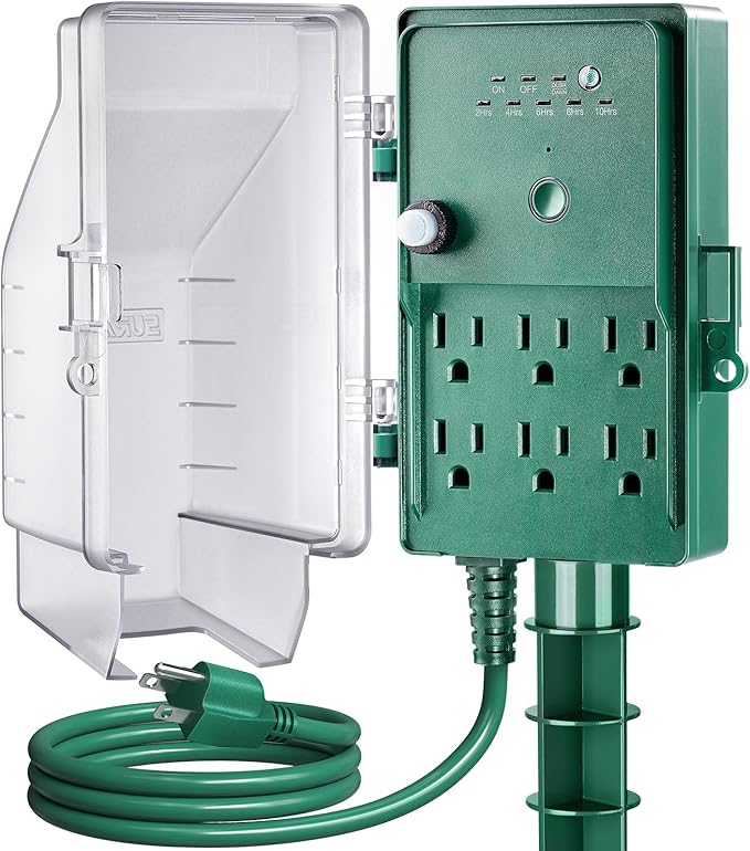 - Waterproof for Outdoor Use: Made from durable insulating and flame-retardant materials with a 14/3C heavy-gauge SJTW power cord; This outdoor timer outlet waterproof design protects against rain, snow, and dust; Equipped with a thick stake to keep outlets elevated from waterlogged areas