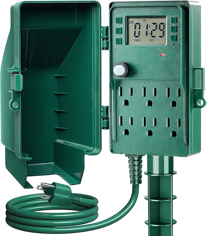 - Easy Installation and Wall Mountable: Comes with a thicker, tougher stake for easy ground insertion; Wall-mountable with two mounting holes on the back; Ideal for setting up Christmas lights, outdoor string lights, and seasonal decorations with an outdoor timer for lights waterproof