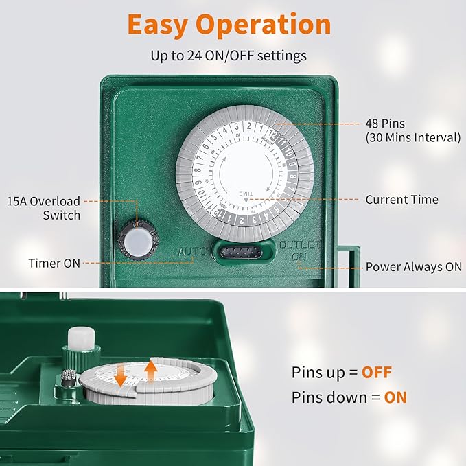 - Automatic 24-Hour Programmable Stake Timer: Features 48 pins for up to 24 ON/OFF settings at 30-minute intervals; Easily switch between Auto Timer and Power Always ON with a slide button; The schedule repeats daily, saving you time, power, and hassle