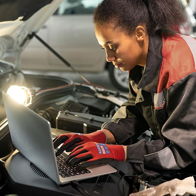 KAYGO Safety Work Gloves PU Coated for Men and Women- KG11P,12 Pairs,Seamless Knit Glove with Two Fingers Touchscreen,Ideal for General Duty Work (Red,XL)