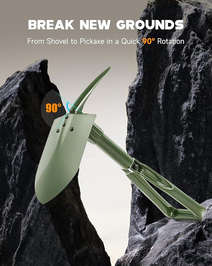 - Multifunctional Tool: Our green shovel is fitted with a fast-rotating locking system allowing you to switch from shovel to pickaxe or hoe in seconds; the triangular handle gives you excellent grip while using this tool.