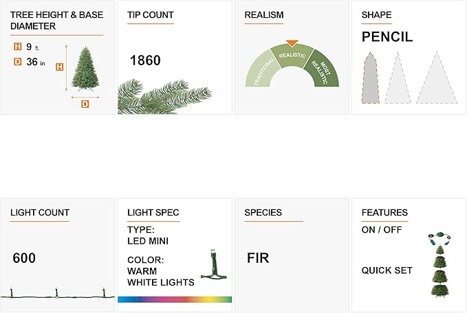 - 🎄【IDEAL SIZING】: The artificial Christmas tree stands 9 feet tall and 3 feet in diameter at the base. Elegant pencil fir without taking much space. Product may ship compressed -You can adjust all the branches with an elegant look like the images.