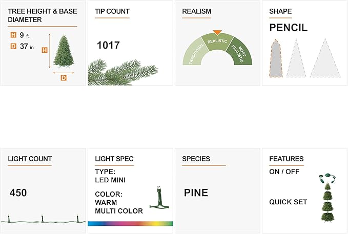 - 🎄【NATURAL LIFELIKE APPEAL】: Our artificial branches look ultra-realistic and lifelike. There are 1,017 individually crafted branch tips, including 262 pine needles and 755 PVC tips, pre-strung with 450 warm white/Multi-color LED light bulbs. This full-bodied tree is as charming as the real thing.