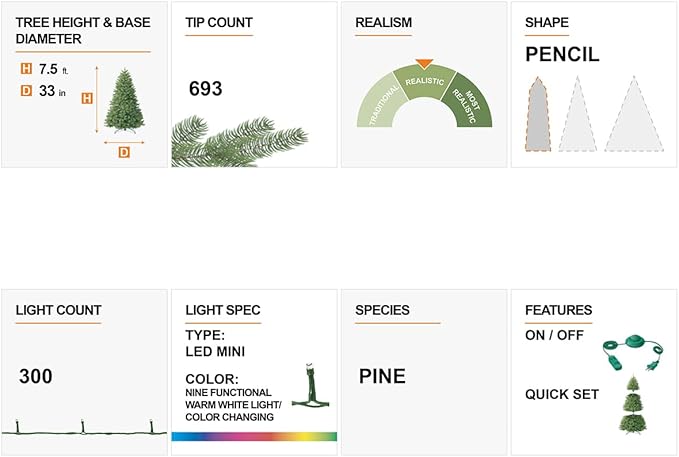 - đăNATURAL LIFELIKE APPEALă: Our artificial branches look ultra-realistic and lifelike. With 693 individually crafted branch tips, including 208 pine needles and 485 PVC tips, pre-strung with 300 warm white/Multi-color LED light bulbs. This full bodied tree is as charming as the real thing.