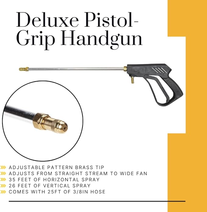 - REACH HARD SPOTS: Deluxe handgun sprays up to 35 feet horizontally and 25 feet vertically. Easily treat trees, ditch lines, or targeted areas without repositioning the sprayer