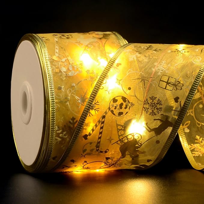 - UNIQUE DESIGN: Double layers of organza sheer ribbon lights with gold glitter Xmas pattern and gold edge are especially suitable for decorating Christmas trees. 2-1/2Inch by 33Ft 100 Led Christmas tree ribbon lights will create a romantic atmosphere. The USB lead length is 10-1/2ft.