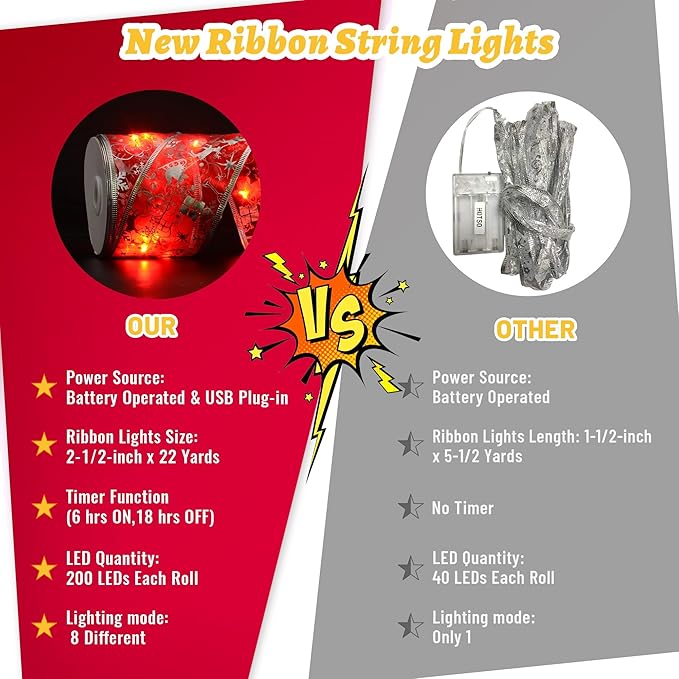 - BATTERY OPERATED & USB PLUG-IN: Our ribbon lights are designed with a 2-in-1 waterproof battery box, which allows you to light it up with 3 AA batteries(Not Included). If you don't want to constantly replace the batteries, then just plug into some valid power supply to light it up! It's a cost-effective solution for Christmas light decorations!