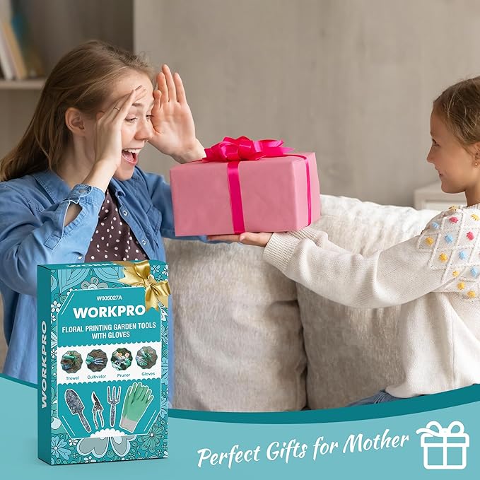 WORKPRO Aluminum Garden Tool Set, 4PCS Heavy Duty Hand Garden Tools with Box Include Trowel, Rake, Pruner, Garden Gloves, Blue Floral, Garden Gifts