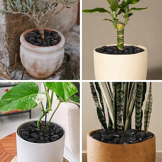 - NATURAL RIVER ROCKS: Lechloris provide you with durable, high quality, non-toxic and eco-friendly rocks from natural. Pebbles are slight polished to produce the most consistent in color, without blemished to last years and resists fading for long-lasting beauty. Use our black rocks as a cost-effective substitute to mulch along outdoor landscape design,their natural propertis will make them last longer.