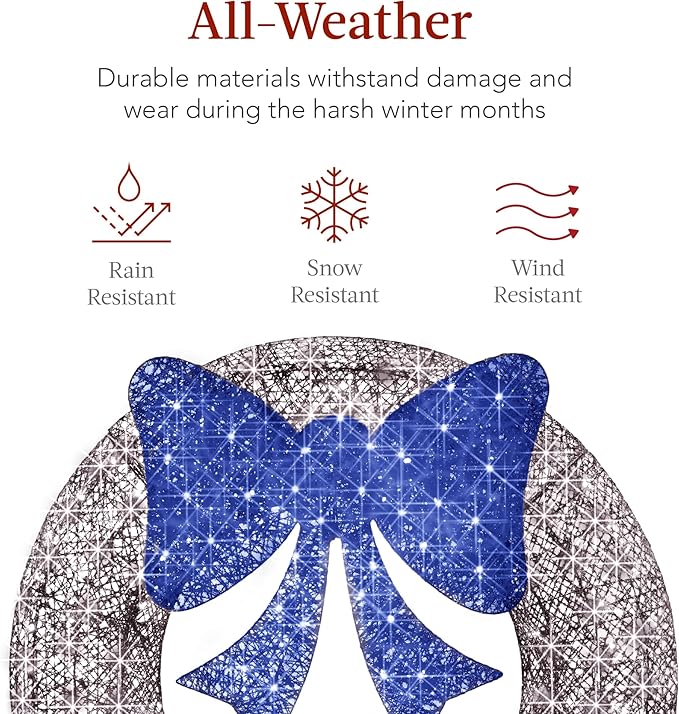 - ALL-WEATHER: This wreath features a heavy wire frame overlaid with rain, snow-, and wind-resistant glittery fabric to withstand the harsh winter months