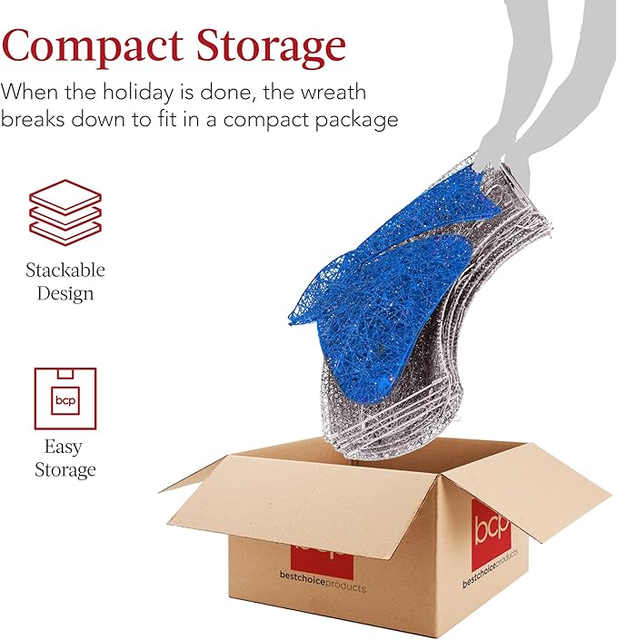 - COMPACT STORAGE: When the holidays are over, break this wreath down and stack the pieces together to fit in a handy storage bag or box of your choice; OVERALL DIMENSIONS: 60"(Dia) x 7"(Thick)