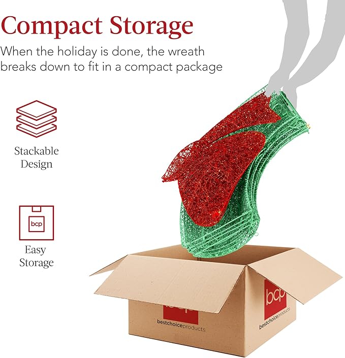 Best Choice Products 60in Pre-Lit Outdoor Christmas Wreath Decoration, LED Metal Holiday Decor for Home Exterior, Garden w/ 206 Lights, Bow - Green/Red