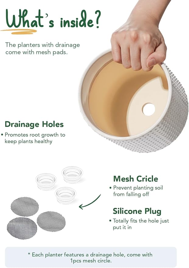 - Drainage Hole and Accessories: Each ceramic pots for plants features carefully designed drainage hole to maintain optimal soil moisture; the inclusion of silicone plugs and mesh pads provides added convenience, giving you flexibility in how you care for your plants