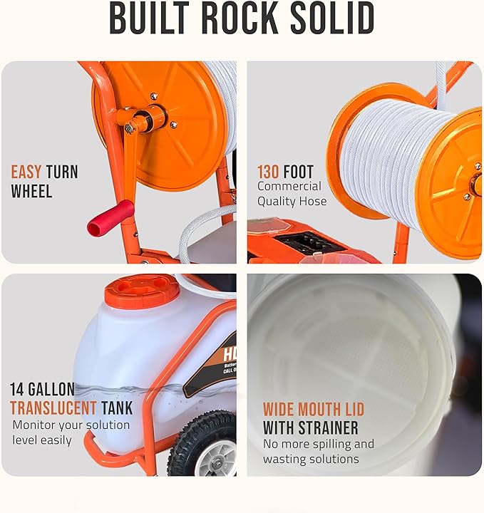 - Large Cart with Oversized Wheels: The 14-gallon sprayer's steel frame and oversized off-road pneumatic tires make it perfect for smooth transport over rugged terrain and uneven ground.