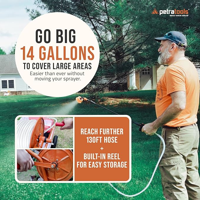 - 130' Commercial Grade Hose with Storage Reel: Get the longest garden sprayer hose on the market to easily cover large yard areas without moving your sprayer! Features a heavy-duty wand and trigger sprayer plus 7 swappable nozzles for all your jobs, from lawn chemicals to weed and herbicide.