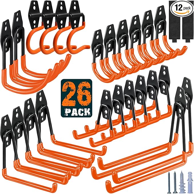 26 Pack Garage Hooks Heavy Duty Utility Steel with Anti-Slip Coating Wall Mount Storage Organizer for Hanging Power and Garden Tools, Ladders, Hose, Bikes, Ropes, Bulk Items, and More