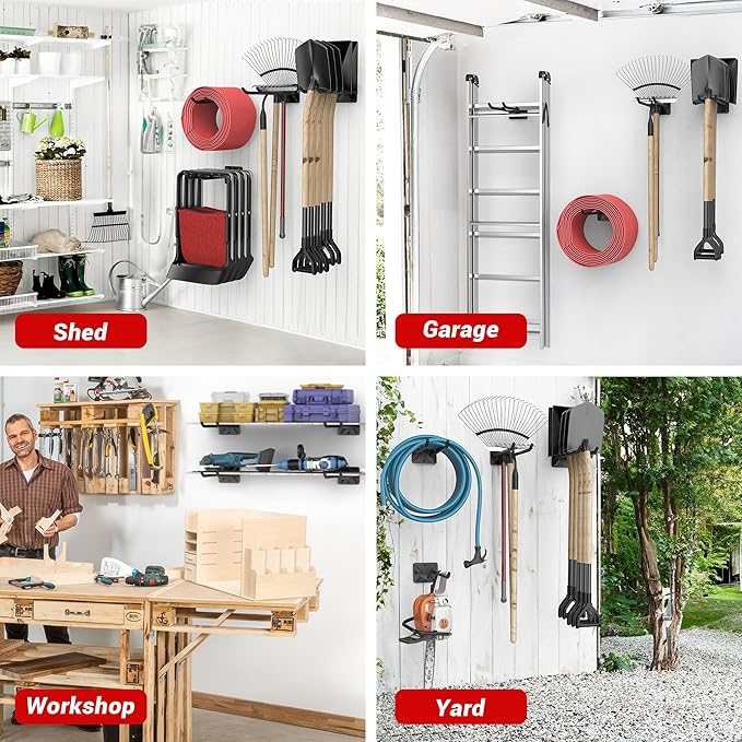 - WIDELY USED — 12.4 inch long utility storage hooks can help you store many garage tools. Garage Tool Organizer is suitable for organizing all kinds of tools,such as ski rack,tire rack, hoses, brooms, racquet, garden tools ,rain boots, rakes, shovels, chairs etc.