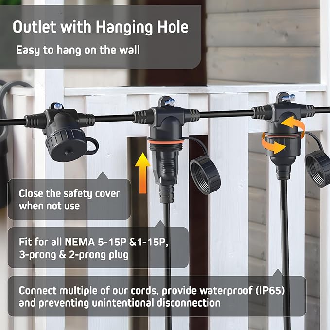 - SAFETY OUTLET COVERS The 3 grounded outlets extension cord is rated for use in wet locations; Each outlet plug comes with a weatherproof cover which will protect against rain, snow, and dust