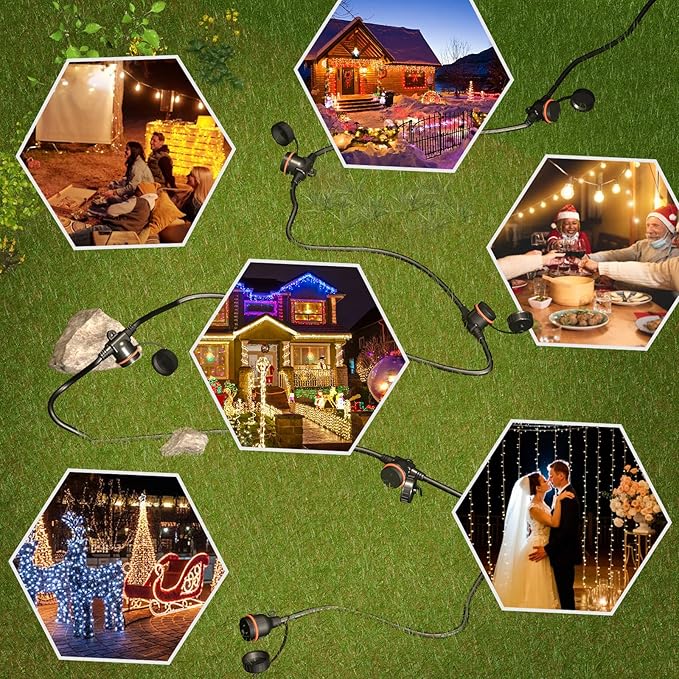 - 50FT 6 OUTLETS Total length 50 feet with 6 outlets; Each outlets evenly-spaced apart from each plug (10'+8'+8'+8'+8'+8'); Black extension cord with 6 outlets allow you to plug in more devices in 1 cable. Easy to set up landscape lighting, outdoor string lights, Christmas decoration and multiple electrical devices