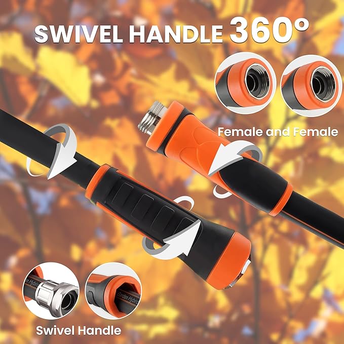 - Swivel Handle- The movable handle allows the hose to rotate freely to prevent twisting, the handle can also fix the fitting to make the connection with faucet/nozzle/sprinkler/hose reel more easily and effortlessly.