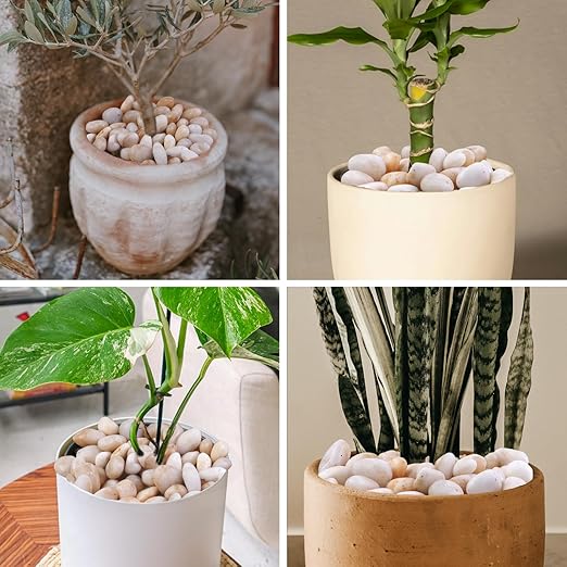 - ROUND AND SMOOTH: Our cream white pebbles for plants are tumbled to produce the smooth and round rock for all creative interior and exterior designs. No sharp edges, ready to get on your feet. River rocks are gift from nature, so they are in different shapes such as oval, round etc. Due to their shape, these pebbles are perfect for bottom of planters for drainage to help soil retain moisture. At the same time, the river rocks make planters have a pop of elegance.