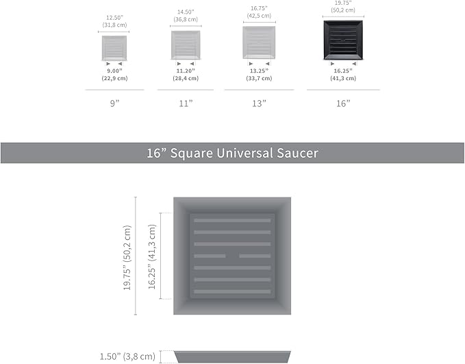 - UNIVERSAL: This shallow basin plate will add beauty and protection to a variety of planter styles. This size is ideal for planters with base size: 16” x 16” inside diameter.
