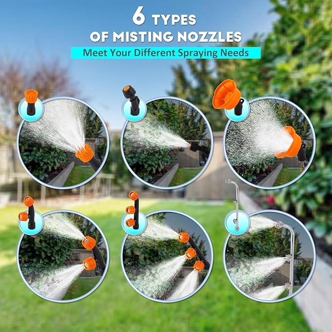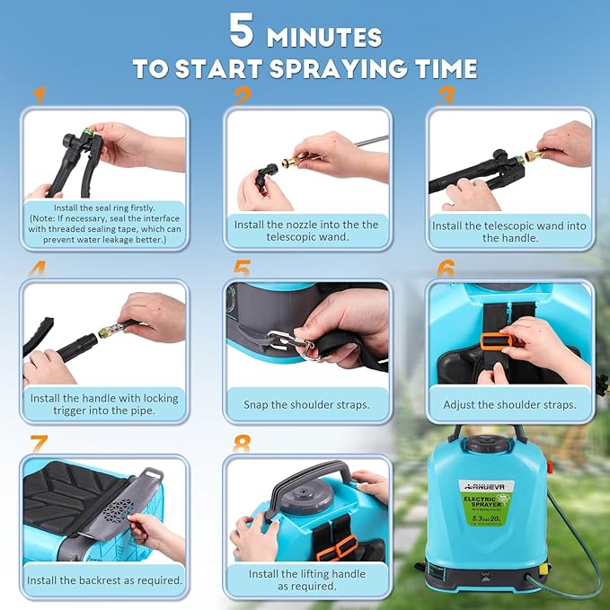 - Easy To Assemble The kit offers all accessories you need: mist nozzle×6(single nozzle, double nozzle, three nozzle, metal three nozzle, four hole pattern nozzle, six hole pattern nozzle), backrest×1, telescopic wand×1, shoulder strap×1, charger×1, seal ring×4, 5.3 gal/20l water tank×1, etc . The installation is comprehensible and can be completed within 5 minutes by following the instructions.
