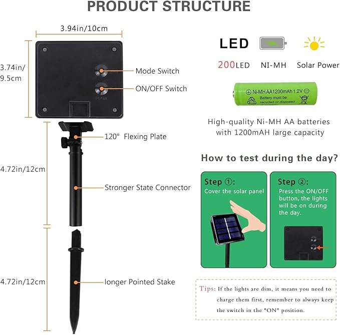 - 8 Lighting Modes, Memory Function and Auto On/Off: These solar Christmas twinkle lights have the on/off button and mode button. You can select 8 different modes to satisfy your diverse needs by pressing the mode button.And the built-in memory chip saves your last modes setting, so there is no need to reset it again